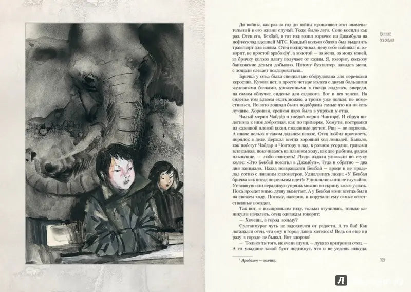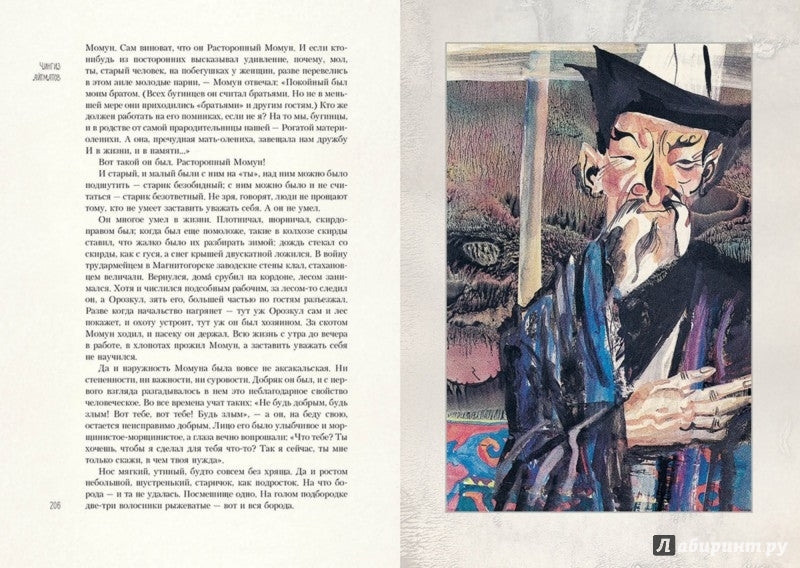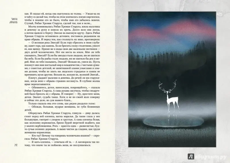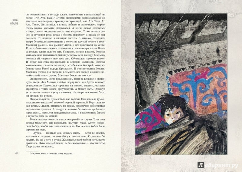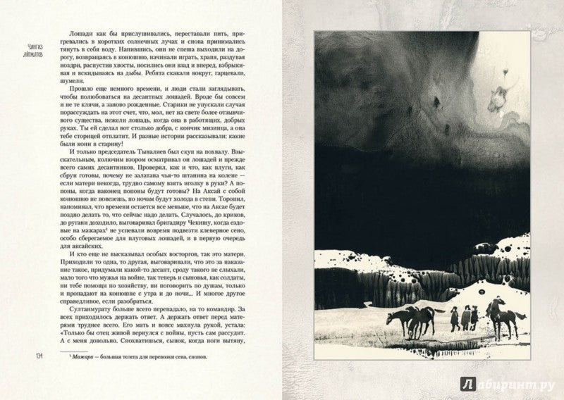 Иллюстрации Светозара Острова намеренно не акцентируют внимание на трагических событиях. Зато они созвучны самой прозе Айтматова, "суровой и нежной", проникнутой красотой природы и фольклорно-мифологическими мотивами. Поэтому на рисунках по совершенно пустынном миру мчится табун лошадей, Рогатая мать-олениха скачет сквозь время и пространство, а из морских глубин выныривает Рыба-женщина. Это те, кто помогут героям сделать правильный выбор.